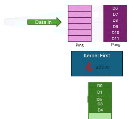 然后,一旦內(nèi)核開始從ping緩沖區(qū)讀取數(shù)據(jù)并將其寫入其輸出緩沖區(qū),輸入pong緩沖區(qū)就會并行填充,為下一次內(nèi)核調(diào)用做好準備。從圖形層面來看,我們無法在輸入端做出更多改進
