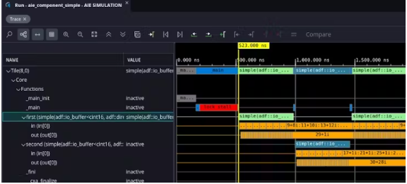 在啟用了Traces的情況下運行AI Engine仿真時,我們可以看到內(nèi)核的第一次迭代是在523ns之后開始的。這意味著在大約523 ns后,ping緩沖區(qū)被32個樣本填滿。