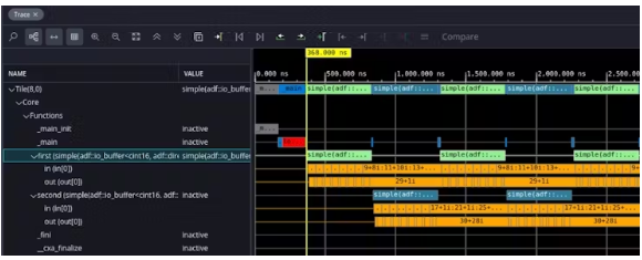在進行更改并運行AI引擎模擬器并啟用trace后,我們可以看到內(nèi)核的第一次調(diào)用現(xiàn)在發(fā)生在337ns之后