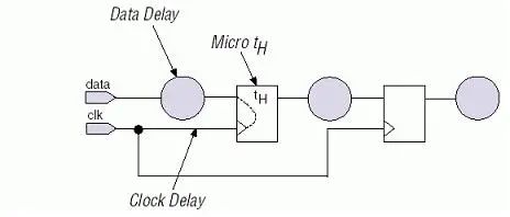圖6 tsu示意圖 (注:這里定義Setup時間是站在同步時序整個路徑上的,需要區(qū)別的是另一個概念Micro tsu。Micro tsu指的是一個觸發(fā)器內部的建立時間,它是觸發(fā)器的固有屬性,一般典型值小于1~2ns。在Xilinx等的時序概念中,稱Altera的Micro tsu為setup時間,用Tsetup表示,請大家區(qū)分一下?;氐紸ltera的時序概念,Altera的tsu定義如下:tsu = Data Delay – Clock Delay + Micro tsu) Clock Hold Time (tH) 時鐘保持時間是只能保證有效時鐘沿正確采用的數(shù)據和使能信號的最小穩(wěn)定時間。其定義如下圖所示:
