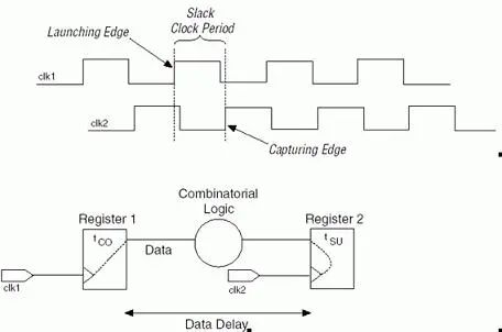 圖9 slack示意圖 Slack = Required clock period – Actual clock period Slack = Slack clock period – (Micro tCO+ Data Delay + Micro tSU) Clock Skew指一個同源時鐘到達兩個不同的寄存器時鐘端的時間偏移,如下圖所示。