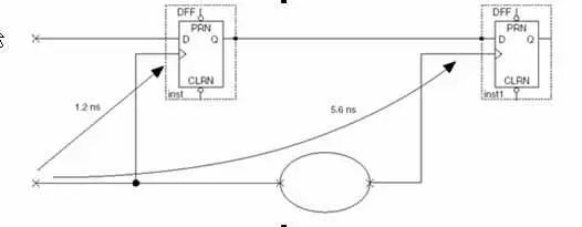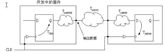 圖2 輸入到達時間示意圖 定義的含義是輸入數(shù)據在有效時鐘沿之后的TARRIVAL時刻到達。則, TARRIVAL=TCKO+TOUTPUT+TLOGIC 公式1 根據上面介紹的周期(Period)公式,我們可以得到: Tcko+Toutput+Tlogic+Tinput+Tsetup-Tclk_skew=Tclk; 公式2 將公式1代入公式2:Tarrival+Tinput+Tsetup-Tclk_skew=Tclk, 而Tclk_skew滿足時序關系后為負,所以 TARRIVAL +TINPUT+TSETUP 這就是Tarrival應該滿足的時序關系。其中TINPUT為輸入端的組合邏輯、網線和PAD的延遲之和,TSETUP為輸入同步元件的建立時間。 F 數(shù)據延時和數(shù)據到達時間的關系