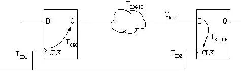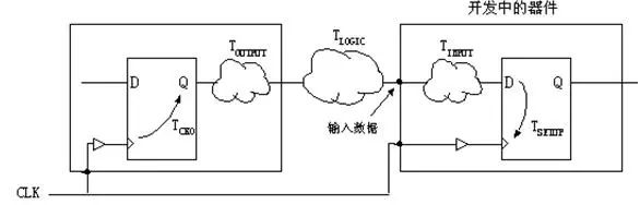 圖1 周期的定義 時鐘的最小周期為: TCLK = TCKO +TLOGIC +TNET +TSETUP -TCLK_SKEW TCLK_SKEW =TCD2 -TCD1 其中TCKO為時鐘輸出時間,TLOGIC為同步元件之間的組合邏輯延遲,TNET為網線延遲,TSETUP為同步元件的建立時間,TCLK_SKEW為時鐘信號TCD2和TCD1延遲的差別。 D 數(shù)據和時鐘之間的約束 為了確保芯片數(shù)據采樣可靠和下級芯片之間正確地交換數(shù)據,需要約束外部時鐘和數(shù)據輸入輸出引腳之間的時序關系(或者內部時鐘和外部輸入/輸出數(shù)據之間的關系,這僅僅是從采用了不同的參照系罷了)。約束的內容為告訴綜合器、布線器輸入數(shù)據到達的時刻,或者輸出數(shù)據穩(wěn)定的時刻,從而保證與下一級電路的時序關系。 這種時序約束在Xilinx中用Setup to Clock(edge),Clock(edge) to hold等表示。在Altera里常用tsu (Input Setup Times)、th (Input Hold Times)、tco (Clock to Out Delays)來表示。很多其它時序工具直接用setup和hold表示。其實他們所要描述的是同一個問題,僅僅是時間節(jié)點的定義上略有不同。下面依次介紹。 E 關于輸入到達時間 Xilinx的“輸入到達時間的計算”時序描述如下圖所示: