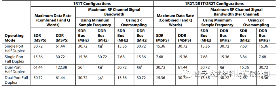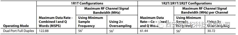 單端口全雙工用于FDD模式,數(shù)據(jù)速率低于30.72MHz的應(yīng)用。在這種模式下,總線分為兩部分,六位專用于接受數(shù)據(jù),六位專用于發(fā)送數(shù)據(jù)。該模式可用于所有的接收器-發(fā)射器配置,總線可以作為SDR或DDR操作。因為在全雙工模式下,總線必須完成兩倍的數(shù)據(jù)傳輸,所以數(shù)據(jù)總線必須以兩倍于TDD模式的速度運行,來實現(xiàn)相同的發(fā)送和接受數(shù)據(jù)速率。