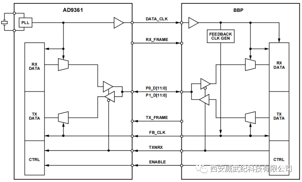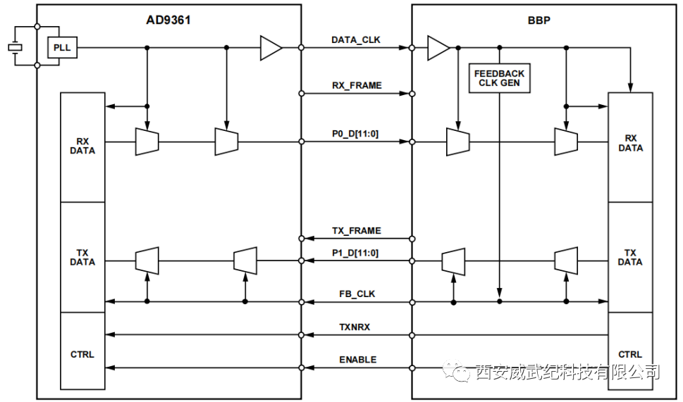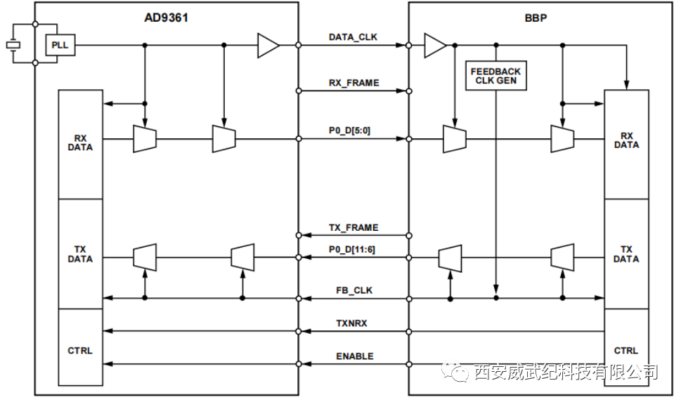 低壓差分信號(LVDS)模式下,AD9361數(shù)據(jù)路徑接口使用并行數(shù)據(jù)總線(P0和P1)在AD9361和BBP之間傳輸數(shù)據(jù),兩條總線(P0和P1)都使用LVDS信號
