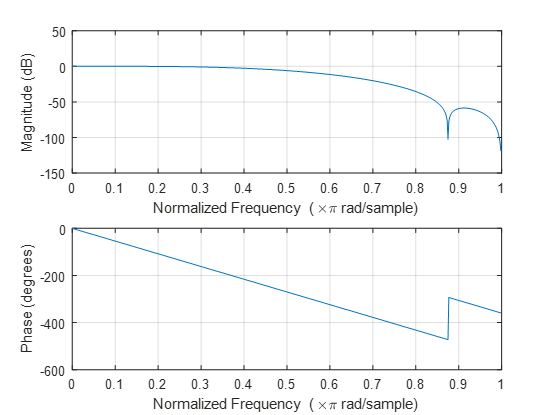 第三級HB2也是一個固定2倍插值低通濾波器,系數(shù)為[?9, 0, 73, 128, 73, 0, ?9]。其幅頻相應如圖6-3所示。