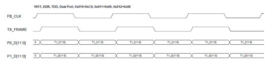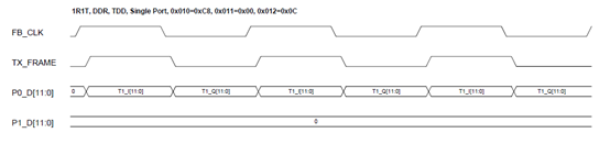 CMOS模式下,所有接口信號都是單端信號。在此電平模式下,允許兩組12bit端口P0_D、P1_D并行使用,即允許雙端口時序。CMOS模式下,單端口信號TX時序如圖7-2,RX時序如圖7-3;P0/1_D和T/Rx_D_P/N的對應關(guān)系可參見硬件連接的spec。