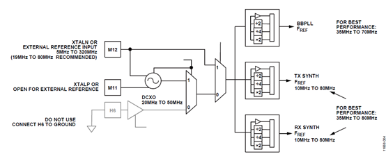 AD9361使用分數(shù)分頻鎖相環(huán)生成一個本地時鐘為信號轉(zhuǎn)換、數(shù)字濾波器、IO端口提供時鐘源。這些PLL均需要一個參考時鐘,這個時鐘可以通過外部晶振提供,或者由外部晶體加上一個可變電容生成所需頻率。在使用外部晶體的情況下,需使用DCXO補償晶體頻率來保證輸出參考時鐘穩(wěn)定。