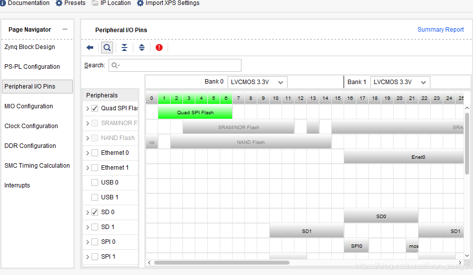2. 打開(kāi)項(xiàng)目后,雙擊打開(kāi) Diagram 原理圖中的 Processing_system7_0, 打開(kāi)配置 ZYNQ 的配置界面,在 Peripheral I/O Pins 項(xiàng),使能 Quad SPI Flash