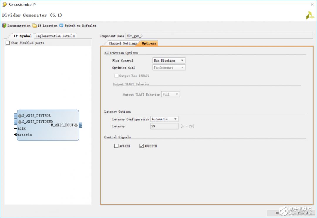 總共就兩頁,非常簡單。需要重點關(guān)注的有三個地方:1 算法實現(xiàn)結(jié)構(gòu)(algorithm type)2 被除數(shù)與除數(shù)的位寬 3 第二頁flow control模式。現(xiàn)來一一說明: