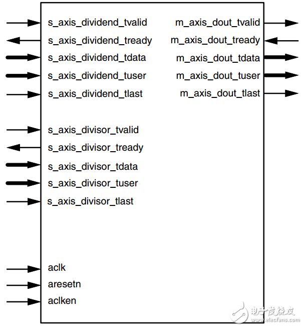 接口劃分得十分清晰,被除數(shù) 除數(shù)和商通道以及必要的時鐘和復(fù)位邏輯接口。每個AXI總線通道總是包括tdata tuser tlast 和握手信號tvalid tready,其中tuser為附加信息,tlast表示流模式下最后一個數(shù)據(jù),相當(dāng)于數(shù)據(jù)包中的包尾處。數(shù)據(jù)傳輸僅在tvalid和tready同時拉高時有效并更新。