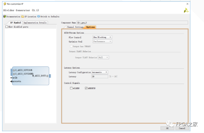 總共就兩頁,非常簡單。需要重點關(guān)注的有三個地方:1 算法實現(xiàn)結(jié)構(gòu)(algorithm type)2 被除數(shù)與除數(shù)的位寬 3 第二頁flow control模式?,F(xiàn)來一一說明: