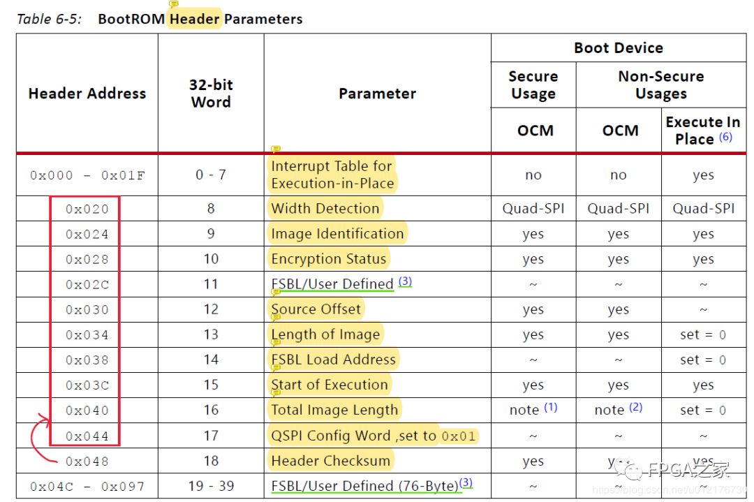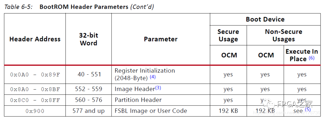 指向Image Header Table,這個(gè)Table里面會(huì)記錄整個(gè)FLASH里面除了FSBL以外,還有幾個(gè)image,包括Bitstream,elf等等。每一個(gè)image會(huì)有一個(gè)Header(不是這里的BootROM Header,而是專門的Header,F(xiàn)SBL里面在介紹),所有的Header組成一個(gè)Table。