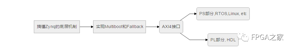 為了完成上述化學(xué)反應(yīng),一個(gè)很重要的方面就是如何協(xié)調(diào)ARM和FPGA(都是Zynq片上的資源),這個(gè)其實(shí)很多開(kāi)發(fā)板的學(xué)習(xí)手冊(cè)都已經(jīng)給出了答案,那就是應(yīng)用AXI4總線。那剩下的問(wèn)題就是,如何實(shí)現(xiàn)Multiboot以及fallback。