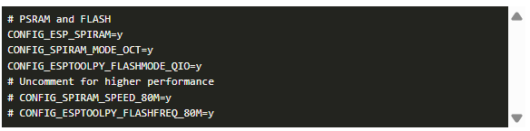 ?80MHz可選模式:默認為40MHz。為了獲得最佳性能,您可以取消注釋最后兩行,以80MHz的速度運行PSRAM和Flash。