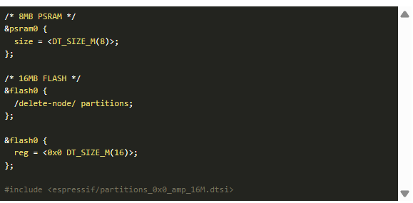 覆蓋文件是硬件設(shè)置的核心,它告訴Zephyr如何處理這塊板上巨大的16MB閃存和8MB PSRAM。