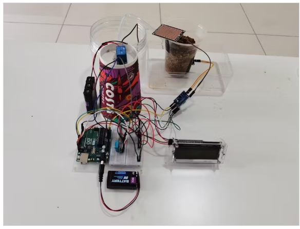 土壤濕度傳感器電路包含4個電子元件,其中土壤濕度傳感器檢測土壤濕度水平,Arduino板處理土壤濕度傳感器模擬量輸入并將其轉(zhuǎn)換為百分比形式,并根據(jù)土壤濕度水平控制何時啟動灌溉過程,LCD顯示屏顯示土壤濕度水平的百分比,灌溉狀態(tài)和泵狀態(tài)。和一個有效的低繼電器控制泵的激活/停用。