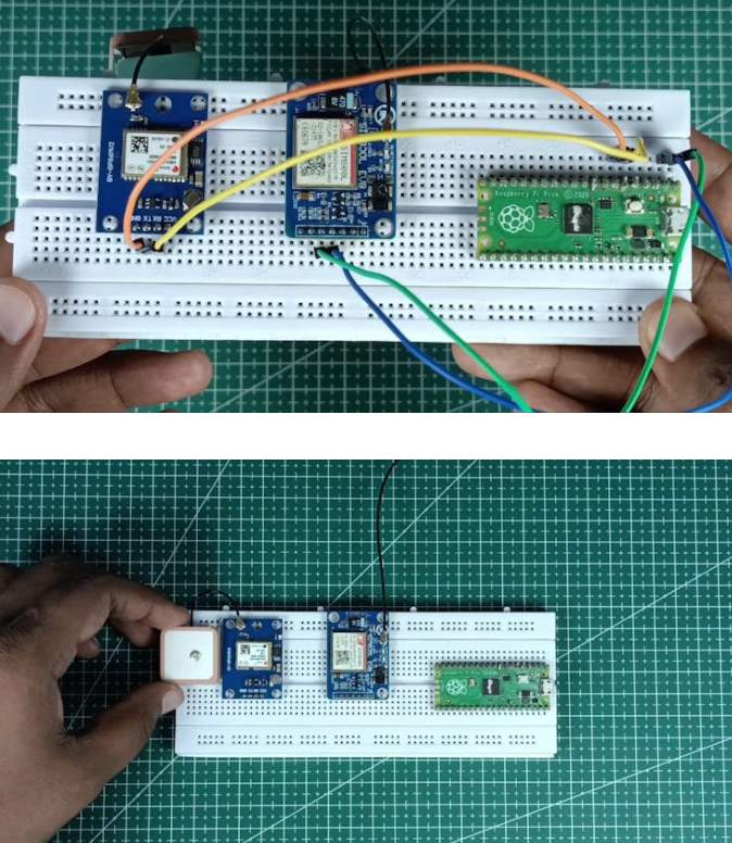 ?將樹莓派Pico, NEO-6M GPS模塊和SIM800L GPRS GSM模塊安裝到面包板上。