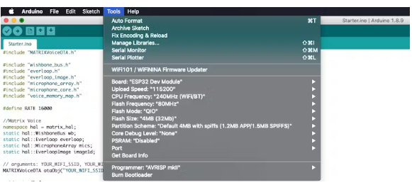 ?你可以修改你的代碼,只要你有MATRIX Voice OTA方法,你可以點擊“Sketch”->“Upload”,代碼就會通過WiFi上傳到你的MATRIX Voice ESP32上。