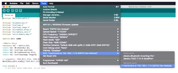 ?關(guān)閉并重新啟動Arduino IDE。大約一分鐘后,Matrix Voice應(yīng)該顯示為一個網(wǎng)口(“Tools”->“port”)。選擇該端口。
