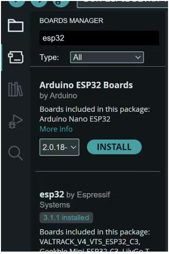 ?搜索“esp32 by expressif”,你會在INSTALL上找到結(jié)果選擇(參考本步驟中的第二個圖像,它是第二個結(jié)果)。