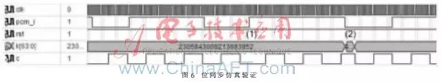 圖6中clk為本地時(shí)鐘,pcm_i為輸入信號,K[63:0]為頻率控制字,c為恢復(fù)時(shí)鐘輸出??梢钥闯?,當(dāng)輸入信號跳變時(shí)時(shí)鐘生成電路開始工作,生成固定頻率的時(shí)鐘信號,時(shí)鐘上升沿位于碼元周期的中間位置,可以更準(zhǔn)確地讀取碼元。在輸入信號的跳變沿,會根據(jù)時(shí)鐘信號與輸入信號的相差來調(diào)整時(shí)鐘相位,圖中(1)所示位置為后向抖動(dòng),時(shí)鐘生成器被復(fù)位,以對齊時(shí)鐘相位;(2)所示為大幅度的前向抖動(dòng),此時(shí)頻率控制字被左移1位,使時(shí)鐘信號相位前移。