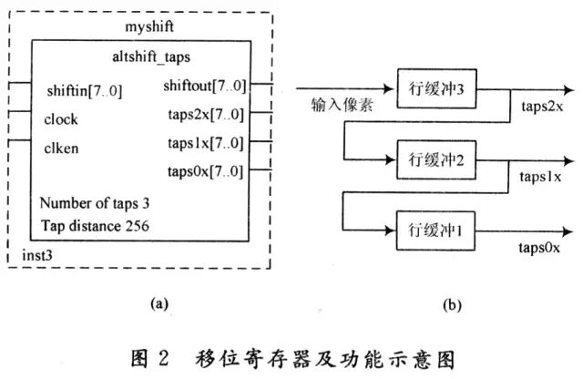 以處理大小為256×256的8位灰度圖像為例進(jìn)行討論。在對(duì)移位寄存器進(jìn)行配置時(shí),shiftin,shiftout設(shè)置為8位,3個(gè)抽頭。相鄰兩個(gè)抽頭相距256。為了方便控制,還需要為該模塊添加時(shí)鐘控制信號(hào),如圖2(a)所示。