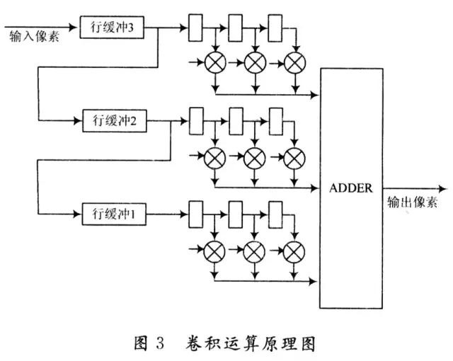 圖 3是3×3圖像卷積運(yùn)算的原理圖??梢钥闯觯瑸榱藢?shí)現(xiàn)卷積運(yùn)算需要做乘法和加法運(yùn)算,如果直接采用分立的D觸發(fā)器和加法器以及乘法器來(lái)完成卷積運(yùn)算,結(jié)構(gòu) 會(huì)很復(fù)雜。在此,采用宏功能模塊中的可編程乘加器模塊和可編程多路并行加法器模塊Parallel_add實(shí)現(xiàn)卷積運(yùn)算,大大簡(jiǎn)化了設(shè)計(jì)。