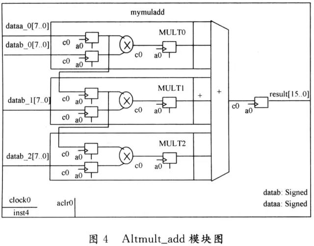 使用可編程多路并行加法器Parallel_add宏功能模塊時(shí),可以自由設(shè)計(jì)輸入數(shù)據(jù)位寬,累加數(shù)據(jù)個(gè)數(shù),定義累加輸入數(shù)據(jù)類(lèi)型,定義時(shí)鐘控制端口,增 加異步清零端口等,能快速便捷地生成所需的加法器模塊。為了實(shí)現(xiàn)卷積運(yùn)算中的加權(quán)和運(yùn)算,宏功能模塊生成的3個(gè)乘加器,每個(gè)乘加器包含3個(gè)乘法器和1個(gè)加 法器,如圖4所示。圖像數(shù)據(jù)從dataa依次輸入,數(shù)據(jù)分別與固定的模板系數(shù)datab_0,datab_1,datab_2相乘。在該實(shí)驗(yàn)中,使用 Verilog HDL語(yǔ)言為各datab設(shè)值,各值分別對(duì)應(yīng)模板中的權(quán)值,并將結(jié)果送給加法器完成加法運(yùn)算。