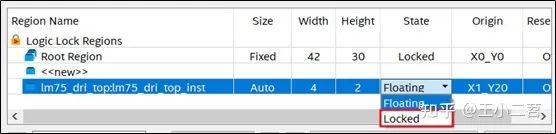 可以看到quartus軟件幫我們創(chuàng)建了一個(gè)邏輯鎖定區(qū)域,這個(gè)區(qū)域的state是floating模式,說明該區(qū)域是可以浮動(dòng),如果不想后續(xù)布局布線時(shí)該區(qū)域移動(dòng),則可以修改為fixed模式,如下: