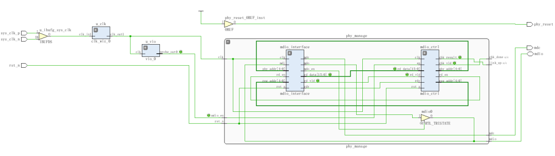 完整的設計,板級調(diào)試是必不可少的。真正地將接口調(diào)通,PHY芯片正確響應才能說明達到設計目的。頂層封裝測試工程,內(nèi)部例化:差分時鐘緩沖原語、PLL、PHY管理頂層封裝以及VIO ILA調(diào)試IP。我們來看下原理圖頂層: