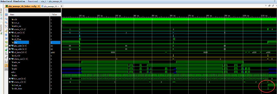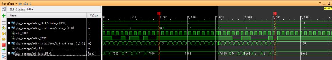 查看debug波形,MDIO時序接口模塊在釋放MDIO串行總線時,由于存在上拉電阻為高電平,下一個MDC時鐘上升沿時刻,PHY拉低MDIO信號響應并得到總線控制權(quán),開始輸出數(shù)據(jù)。