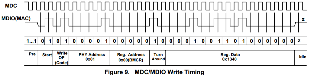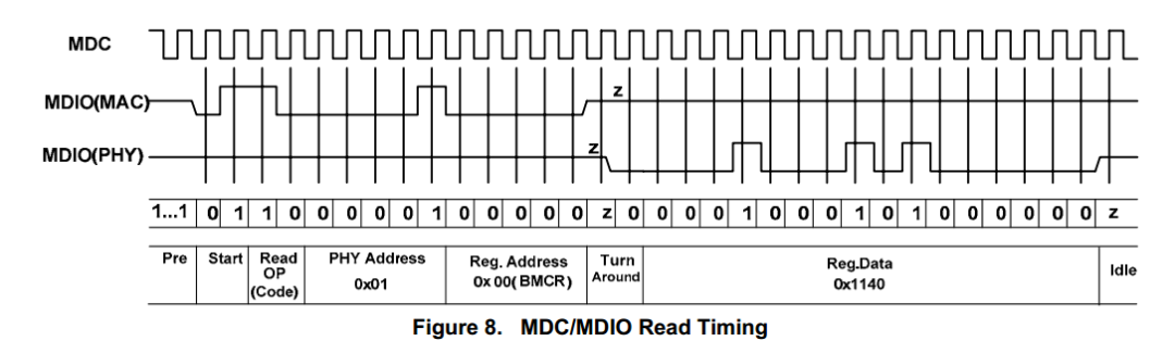 MDC為MAC驅(qū)動時鐘信號,MDIO是串行數(shù)據(jù)總線,需要連接上拉電阻保證idle狀態(tài)下高電平。其中前導碼包含32個比特“1”,PHY地址根據(jù)芯片引腳連接而定,此處為01.turn around域是為了防止讀操作時數(shù)據(jù)沖突,在讀操作過程中MAC和PHY均在第1比特處進入高阻態(tài),PHY在第2比特處驅(qū)動MDIO接口為低電平以占據(jù)總線控制權(quán)。注意兩點:第一如果時鐘信號在讀寫操作后停止,時鐘必須保證至少7個時鐘周期持續(xù)翻轉(zhuǎn)且MDIO高電平從而保證之前的操作完成。故在設計中可以等待一段時間后再拉低時鐘使能信號。第二兩個操作之間至少一個idle比特。