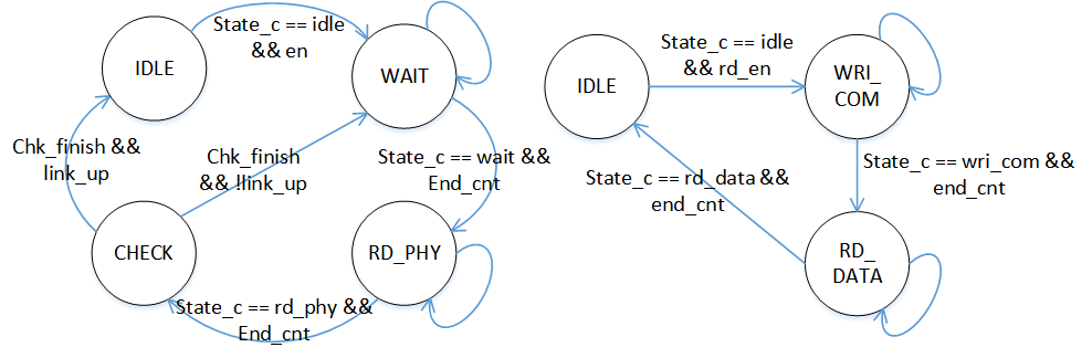 Mdio_ctrl模塊負責完成PHY芯片的配置與檢測邏輯,Mdio接口模塊完成讀寫操作時序。此處僅通過讀操作簡單檢測PHY狀態(tài),暫不進行配置,故兩模塊工作狀態(tài)跳轉(zhuǎn)如圖所示: