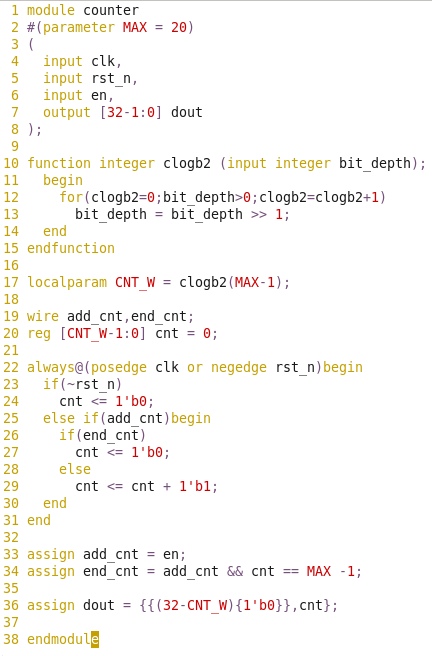 光說這個(gè)軟件沒什么意思,我們來舉個(gè)栗子~設(shè)計(jì)一個(gè)計(jì)數(shù)器,輸出位寬固定32位。當(dāng)使能信號拉高則開始從0計(jì)數(shù)直到最大值后再次從0開始遞增。設(shè)計(jì)代碼counter.v: