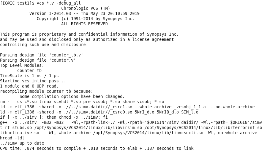 VCS仿真大體分為三步:編譯、仿真以及調(diào)試。編譯命令:vcs *.v -debug_all 命令行界面會顯示些信息: