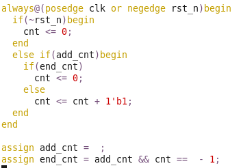 :ab Counter always@(posedge clk or negedge rst_n)beginif(~rst_n)begincnt <= 0;endelse if(add_cnt)beginif(end_cnt)cnt <= 0;elsecnt <= cnt + 1'b1;endendassign add_cnt = ;assign end_cnt = add_cnt && cnt == - 1;