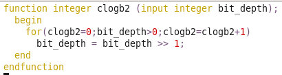 :ab Width_func function integer clogb2 (input integer bit_depth);beginfor(clogb2=0;bit_depth>0;clogb2=clogb2+1)bit_depth = bit_depth >> 1;endendfunction