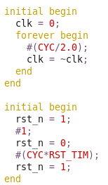 :ab Clock initial beginclk = 0;forever begin#(CYC/2.0);clk=~clk;endend
