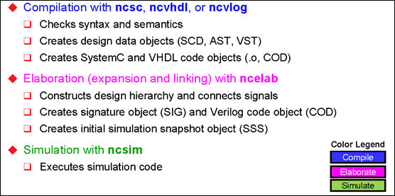 使用ncvlog(ncsc,ncvhdl),ncelab,ncsim命令來實現(xiàn)仿真。