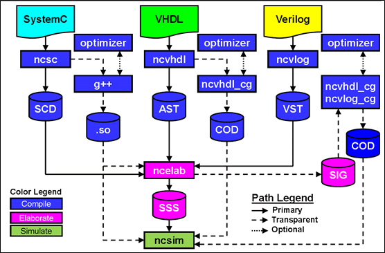 irun支持各種源程序文件輸入,verilog,systemverilog,VHDL,verilog AMS,VHDL AMS,specman e,和其他語言程序編寫的文件如C,C++,并且使用合適的編譯器對其進行編譯。當(dāng)輸入的文件,都編譯完畢后,irun自動啟動ncelab,去elaborate,產(chǎn)生snapshot,最后啟動ncsim仿真器去仿真snapshot。