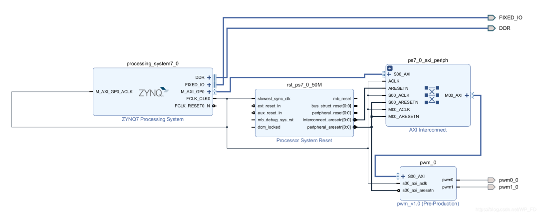 新建verliog文件輸入以下代碼,代碼中的50M時(shí)鐘我們使用PL端的50M晶振提供,所以和PS端屬于異步時(shí)鐘,因?yàn)镻S端提供給PL端的時(shí)鐘也為50M,所以這里我們對(duì)其進(jìn)行簡(jiǎn)單的跨時(shí)鐘域處理,多周期同步,對(duì)兩個(gè)PWM信號(hào)進(jìn)行打兩個(gè)時(shí)鐘節(jié)拍的方式實(shí)現(xiàn)同步,這種方式能解決一些簡(jiǎn)單的異步時(shí)鐘域問(wèn)題: