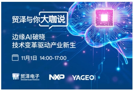 2025年10月27日 – 提供超豐富半導(dǎo)體和電子元器件?的業(yè)界知名新品引入 (NPI) 代理商貿(mào)澤電子 (Mouser Electronics)宣布,2025年“貿(mào)澤與你大咖說”系列技術(shù)活動(dòng)將于11月1日14:00-17:00在線舉辦。本期貿(mào)澤電子將聯(lián)袂半導(dǎo)體巨頭恩智浦和電子元器件領(lǐng)導(dǎo)企業(yè)國巨,匯聚多位資深技術(shù)專家,以“邊緣AI 破曉,技術(shù)變革驅(qū)動(dòng)產(chǎn)業(yè)新生”為主題,共同探討邊緣智能時(shí)代的關(guān)鍵技術(shù)突破,為產(chǎn)業(yè)升級(jí)注入強(qiáng)勁動(dòng)能。