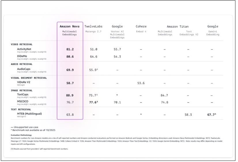 北京——2025年10月29日 亞馬遜云科技宣布,Amazon Nova Multimodal Embeddings多模態(tài)嵌入模型現(xiàn)已在Amazon Bedrock上線,這是一款專為Agentic RAG與語義搜索應(yīng)用打造的頂尖多模態(tài)嵌入模型。該模型是首個通過單一模型支持文本、文檔、圖像、視頻與音頻的統(tǒng)一嵌入模型,能以行業(yè)頂尖的準(zhǔn)確率實現(xiàn)跨模態(tài)檢索。