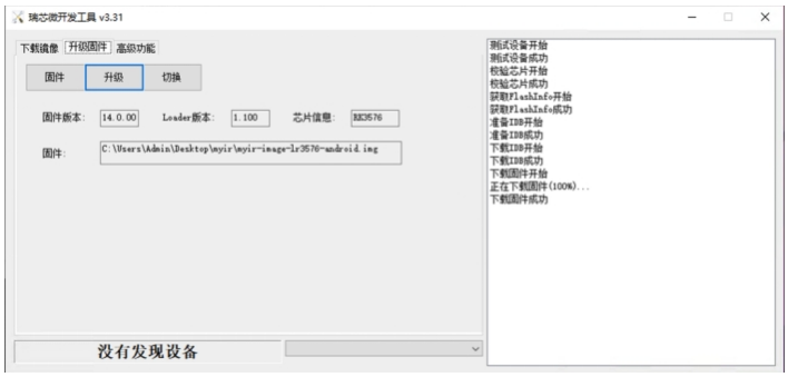 4. 此時(shí)點(diǎn)擊升級固件->固件,選擇剛剛下載的Android鏡像文件(剛下載的為zip文件,解壓出里面的鏡像文件),然后點(diǎn)擊升級按鈕并等待完成: