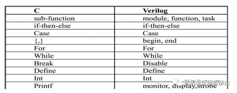 C 語言和 Verilog 的關鍵詞和結構對比: