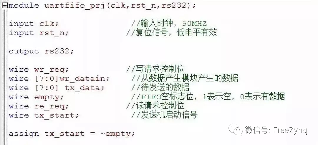 我們將這三個模塊分別定義為dataoutput塊,fifo_ctrl塊和uart_ctrl塊。現(xiàn)在考慮連線,具體到每一根連線,這樣根據(jù)圖來寫代碼要比直接用腦子構(gòu)圖要方便的多。三個模塊,先考慮時鐘和復(fù)位信號線,三個模塊都有,然后,數(shù)據(jù)產(chǎn)生模塊要將產(chǎn)生的數(shù)據(jù)發(fā)給FIFO模塊,所以要有數(shù)據(jù)寫入線,我們定義它為wr-datain,數(shù)據(jù)寫入FIFO塊后總要輸出,這些數(shù)據(jù)就是我們要發(fā)送的數(shù)據(jù),所以定義輸出數(shù)據(jù)線tx_data,先不管FIFO,我們再來定義數(shù)據(jù)發(fā)送模塊的連線,數(shù)據(jù)發(fā)送總要有個啟動信號,所以我們定義變量tx_start,之后,還要有一個輸出端給PC機,我們定義這個輸出端位rs232。