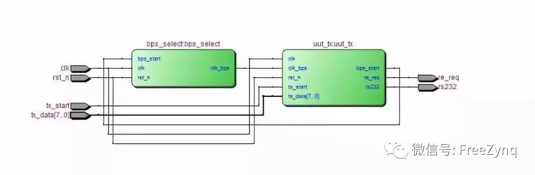 最后我們要寫數(shù)據(jù)發(fā)送部分,之前已經(jīng)講過,數(shù)據(jù)發(fā)送部分還要包括兩個子模塊,一個是波特率匹配模塊,一個是發(fā)送模塊,既然又包括兩個子模塊,那么我們還要構(gòu)建一個框圖