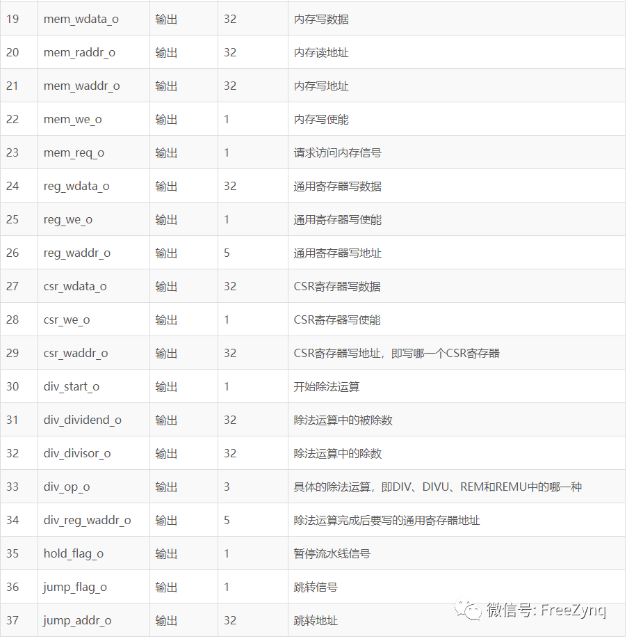 ex:執(zhí)行模塊,純組合邏輯電路,根據(jù)具體的指令進(jìn)行相應(yīng)的操作,比如add指令就執(zhí)行加法操作等。此外,如果是lw等訪存指令的話,則會(huì)進(jìn)行讀內(nèi)存操作,讀內(nèi)存也是采用異步讀方式。最后將是否需要寫寄存器、寫寄存器地址,寫寄存器數(shù)據(jù)信號(hào)送給regs模塊,將是否需要寫內(nèi)存、寫內(nèi)存地址、寫內(nèi)存數(shù)據(jù)信號(hào)送給rib總線,由總線來分配訪問的模塊。