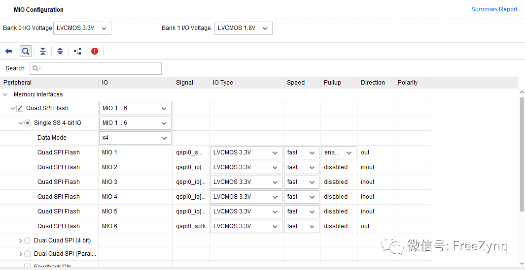 在zynq配置的MIO configuration里選擇Quad SPI Flash的每個(gè)腳為 fast, 如圖: